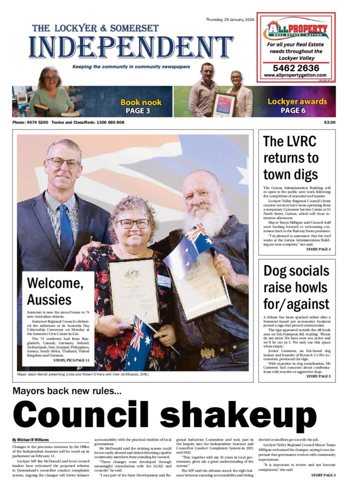The Lockyer and Somerset Independent – 29th January 2026 Subscribe or Login to see the rest of the content. Username Password * Remember Me Forgot Password News Councillors and staff raised vital funds for charities 28/01/2026 Lockyer Valley Regional Council has once again raised vital funds for charities throughout 2025. During the year, Council’s Mayor, councillors and staff raised more than... A life with horses 27/01/2026 PRECEDE Tom Thomsen came to Australia from Denmark at the age of seven. ERLE LEVEY finds out about a life in the bush that has... Family daycare in Lowood 27/01/2026 A new Lowood-based family daycare has held its first open day this week, providing some relief to local parents as demand continues to grow...